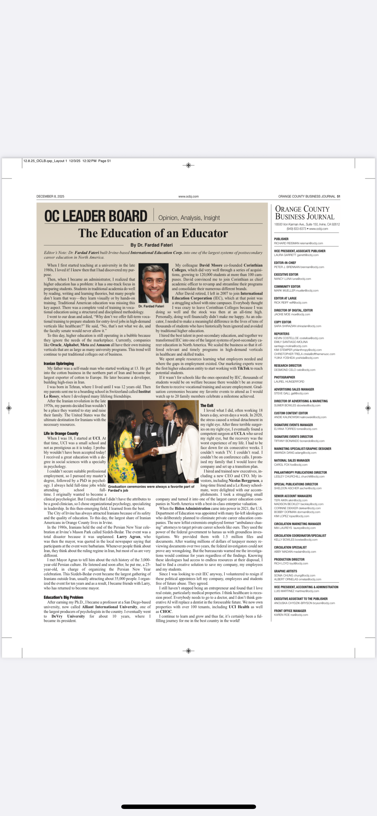 Dr. Fateri in OC Business JournalJoseph CockrellDec 81 min readDr. Fardad Fateri published this op-ed opinion piece in the Orange County Business Journal as part of the OC Leader Board. The Education of an Educator. Click here to view it or read it online at: https://www.ocbj.com/leader-board/oc-leader-board-the-education-of-an-educator/